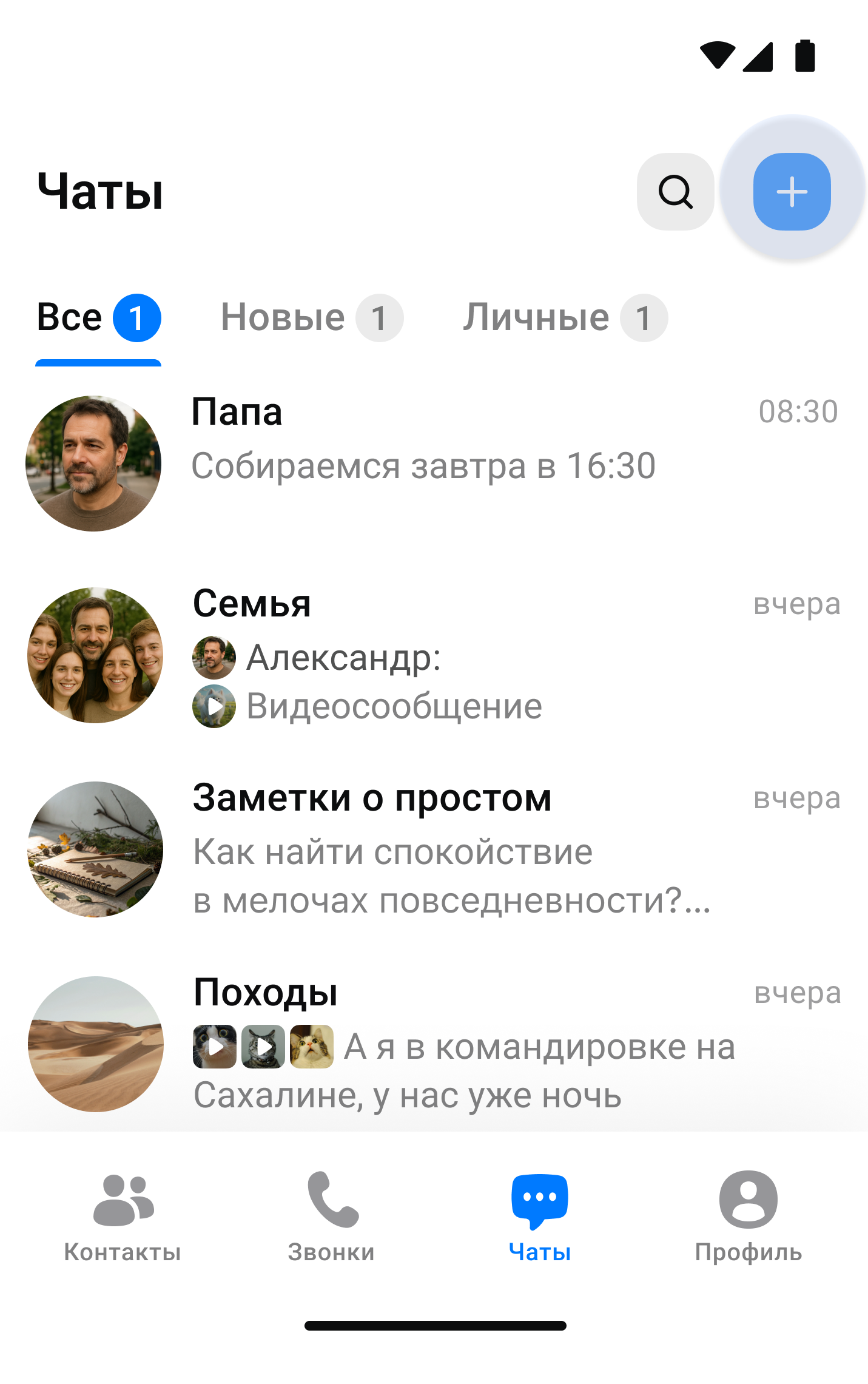 - Откройте мессенджер и справа от заголовка Чаты нажмите плюс
