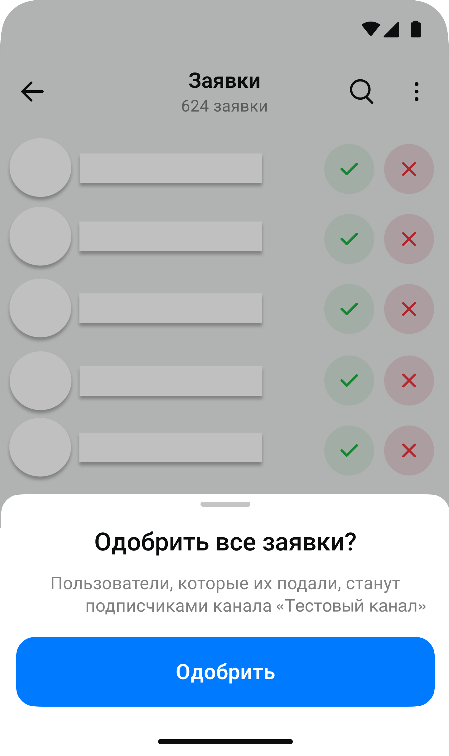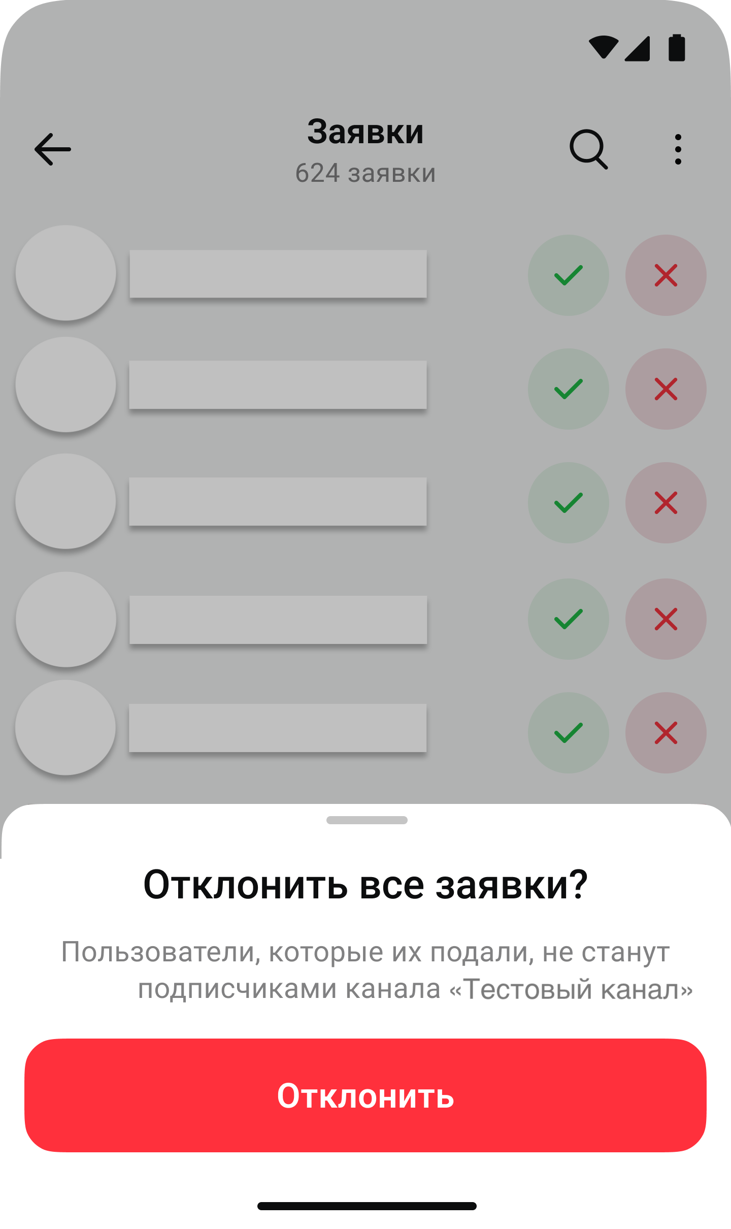 Чтобы одобрить заявку, нажмите на галочку — пользователь будет сразу добавлен в канал и получит уведомление о вступлении. Чтобы отклонить заявку, нажмите на крестик — заявка будет сразу удалена. В этом случае пользователь не получит никаких уведомлений, но сможет подать заявку повторно