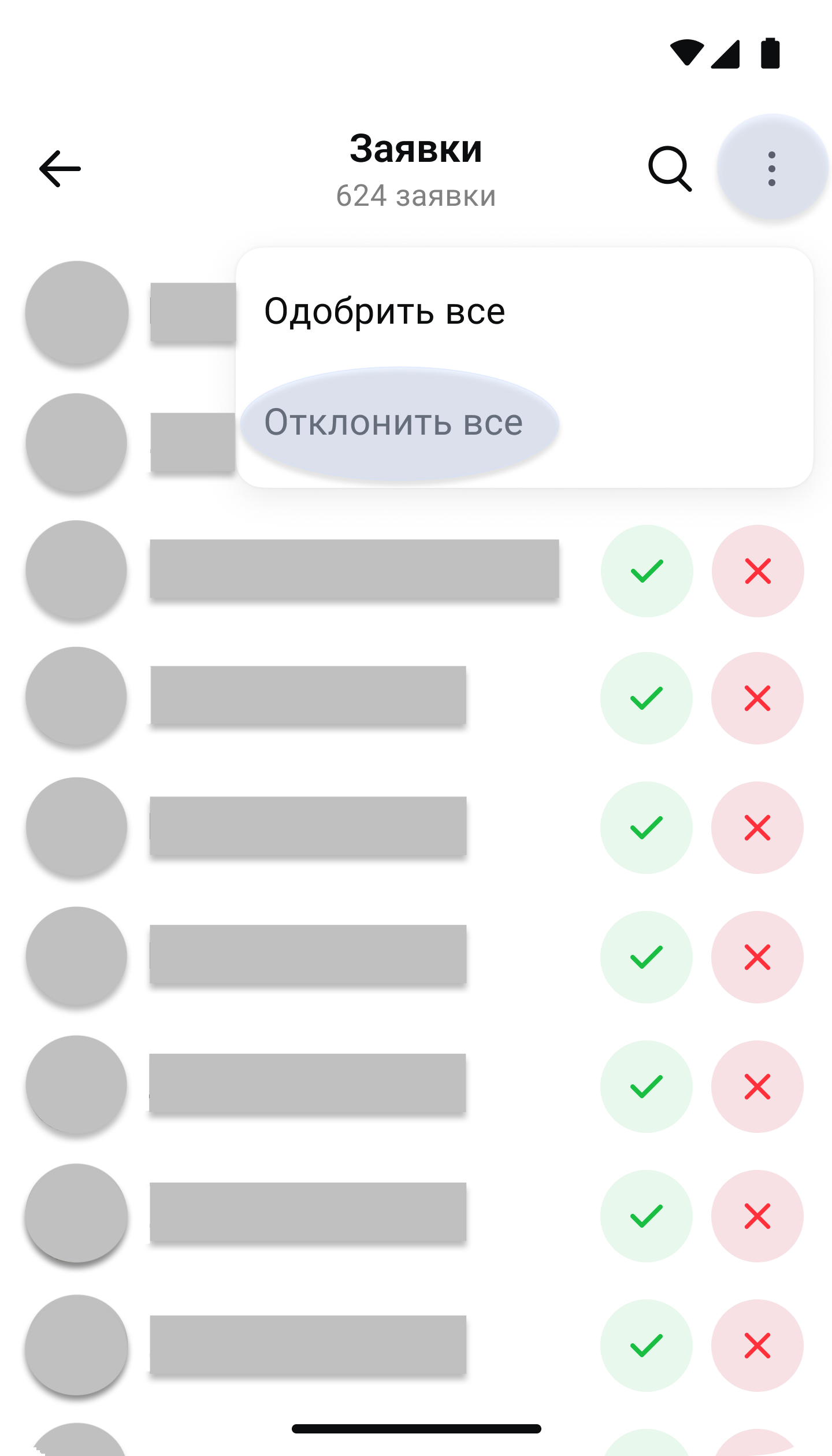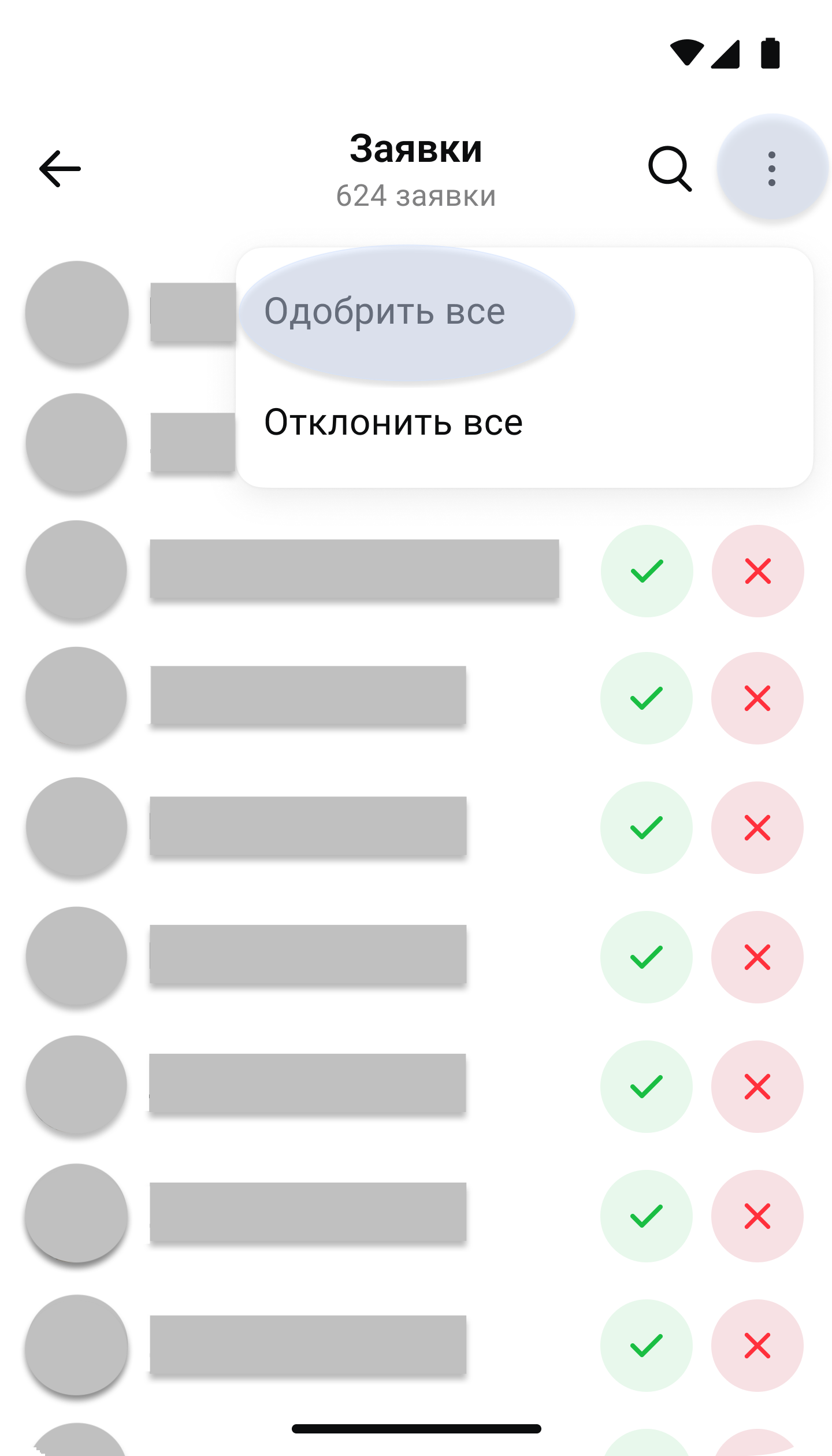 - В правом верхнем углу нажмите на три точки и выберите Одобрить все или Отклонить все — в зависимости от вашего кейса