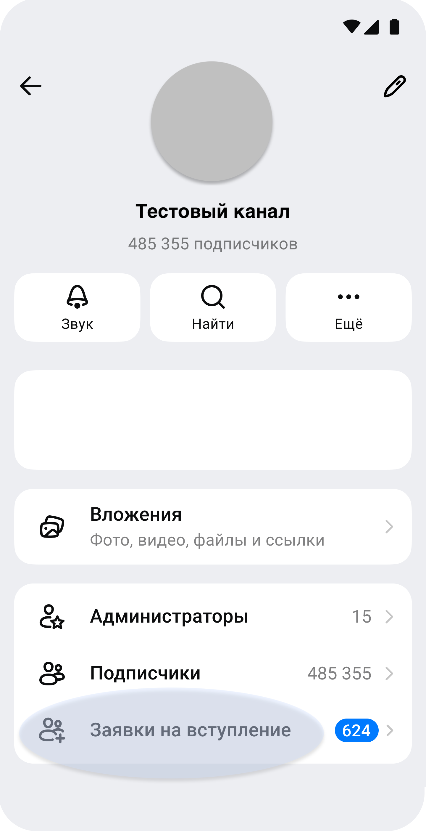 Если у вас появились заявки, вы увидите уведомление «Новые заявки на вступление» прямо в канале. Нажмите на него — вы перейдёте к заявкам